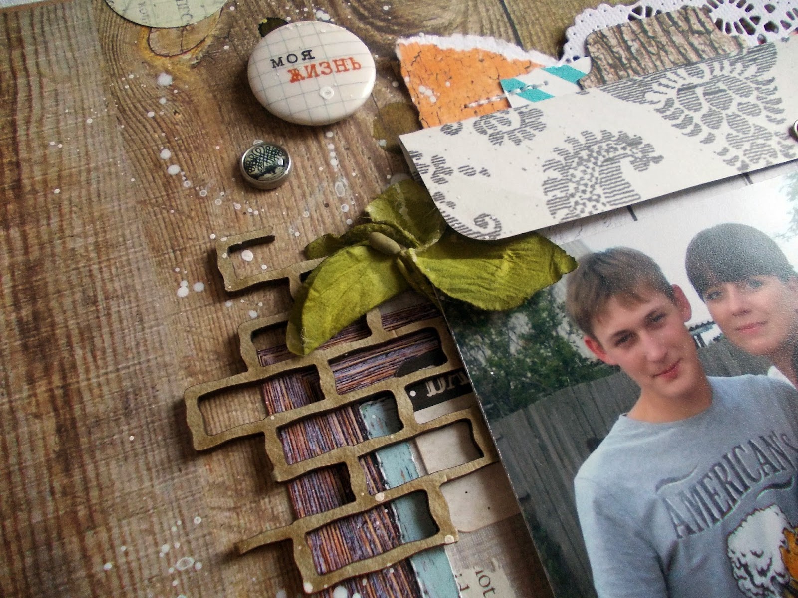 Разворот 1. Начинается все, как водится, с детских фотографий. Здесь и далее на каждой странице есть кармашки и потайные местечки, куда спрятаны еще фото.